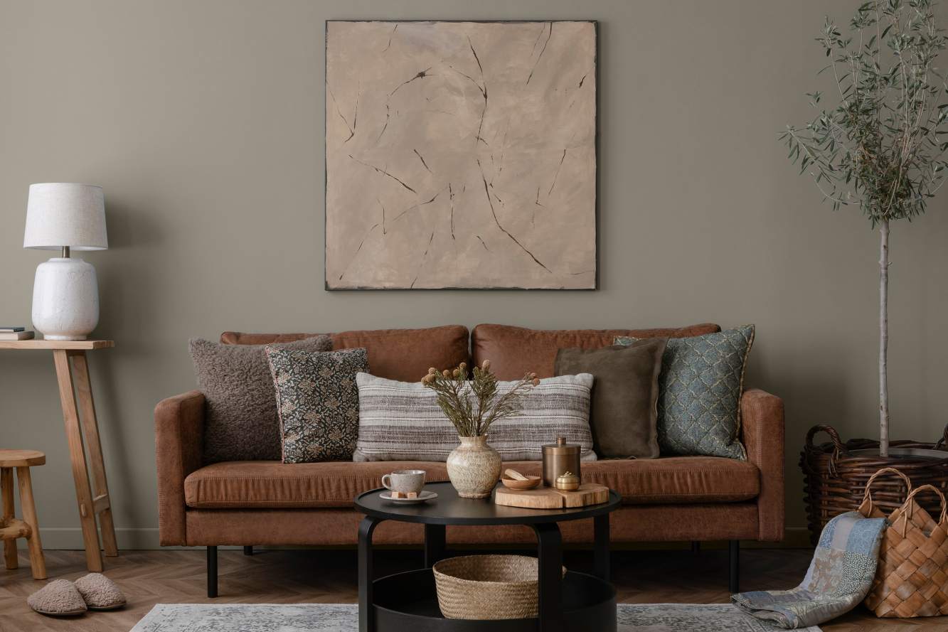 Farbtöne mit brauner Nuance wie „Mangrovenwald“ harmonieren besonders gut mit Naturmaterialien. Zusammen mit hellen Holzmöbeln, cremefarbenen Textilien und Dekoelementen wie Pampasgras kreierst du einen natürlichen und gemütlichen Stil in deiner Wohnung.