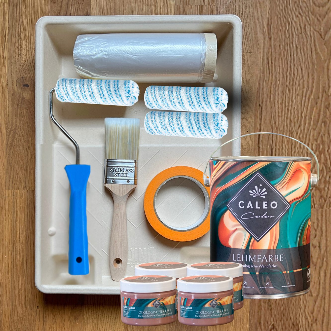 - Abdeckfolie mit Klebeband 1100 mm x 33 m, Farbwanne, Malerkrepp 38 mm, Pinsel 50 mm, Lehmfarbe (Ton 1: 2,25 L, Ton 2+3: jeweils 2x 0,15 L, Heizkörperwalzenbügel 100 mm, Walzen 10 mm (3x)